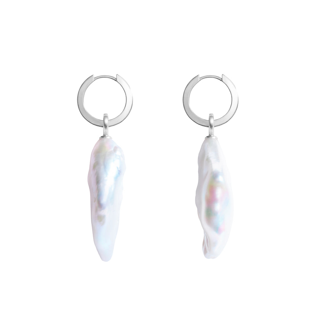 Stunning white flat baroque freshwater pearl hoop earrings. Removable and interchangeable pearls.