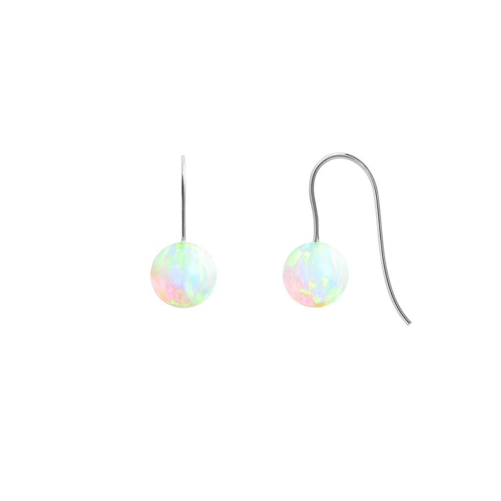 Iridescent lab-grown sea opal duet earrings. Gorgeous flashes of colour can be seen when the earrings rotate. The sea opal radiates a pink glow against the skin and certain backgrounds.